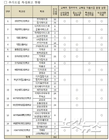 부산교육청(교육감 김석준)은 부산지역 특성화고 15개교에서 2021학년도 신입생 382명을 추가모집한다고 13일 밝혔다.